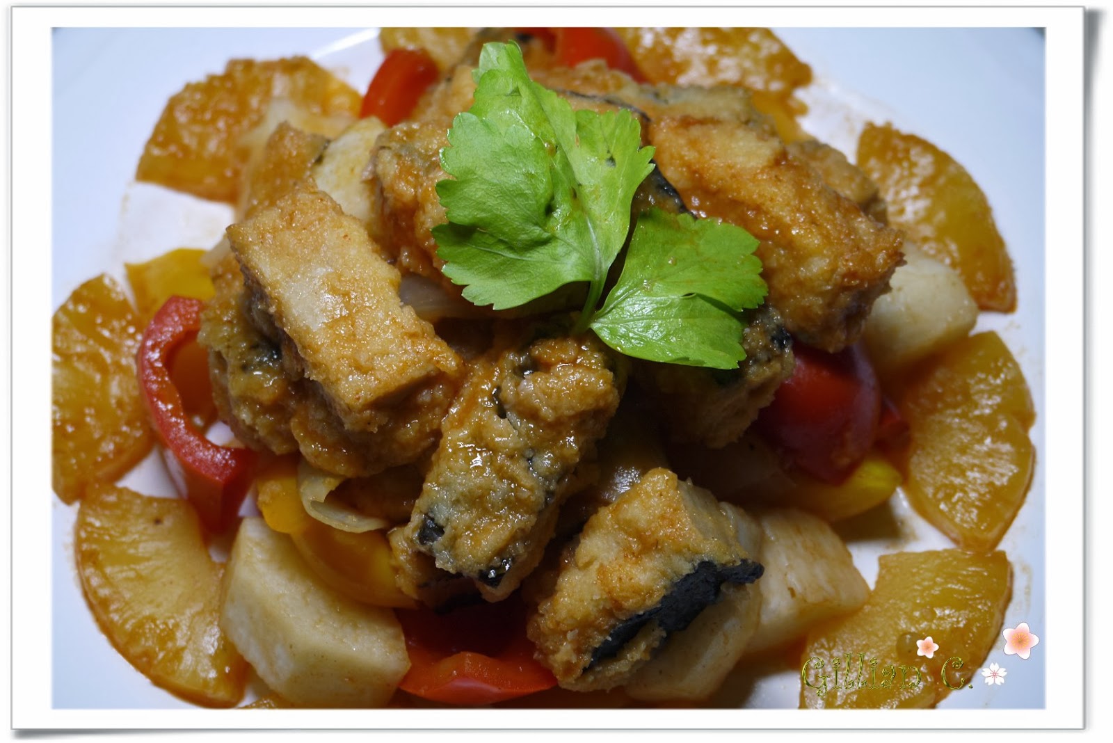 這道年菜我用的食材 是彩色甜椒 洋蔥 山藥 菠蘿罐頭 素魚塊