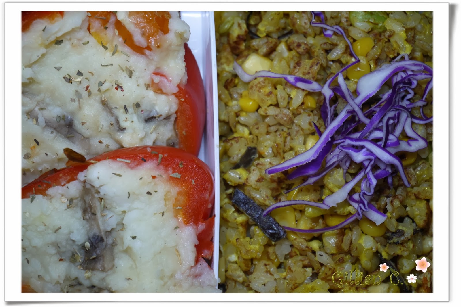 爺的愛心扁東 今天是黃金蛋炒飯 + 烤甜椒鑲蘑菇薯泥