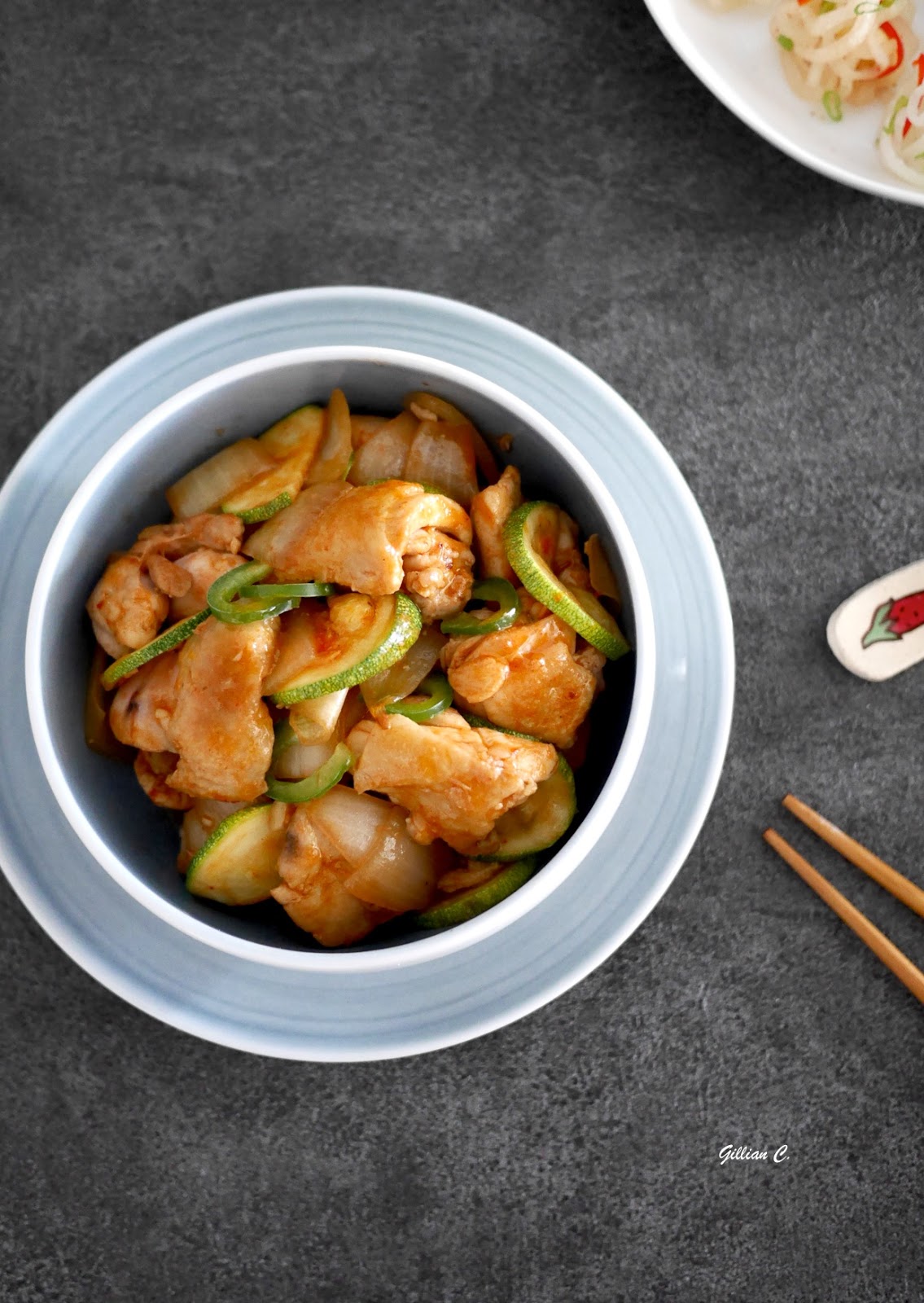食材:去骨雞腿 洋蔥 櫛瓜 蒜頭 辣椒 辣椒粉